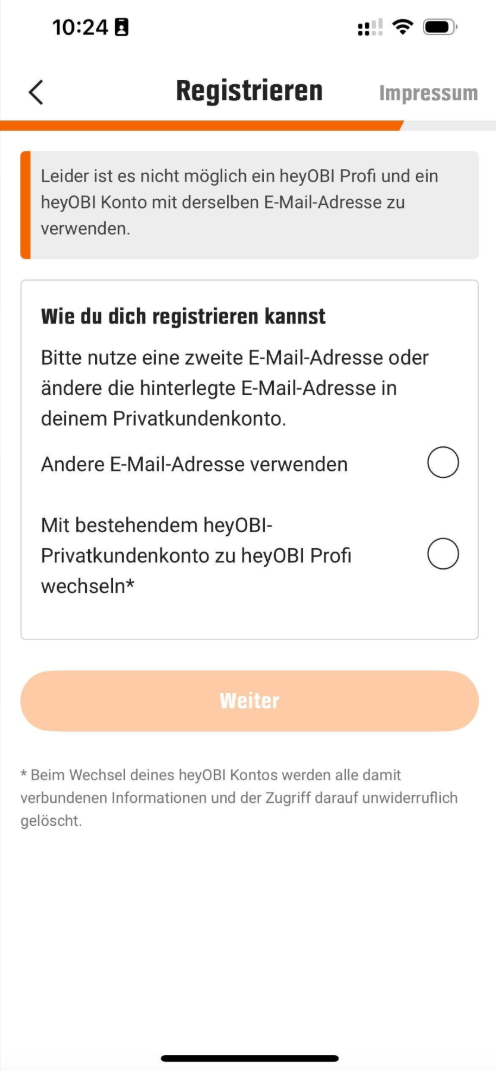 - Die App weist Sie darauf hin, dass zu dieser E-Mail bereits ein Kundenkonto besteht und ob dieses in ein heyOBI Profi Firmenkundenkonto umgewandelt werden soll.