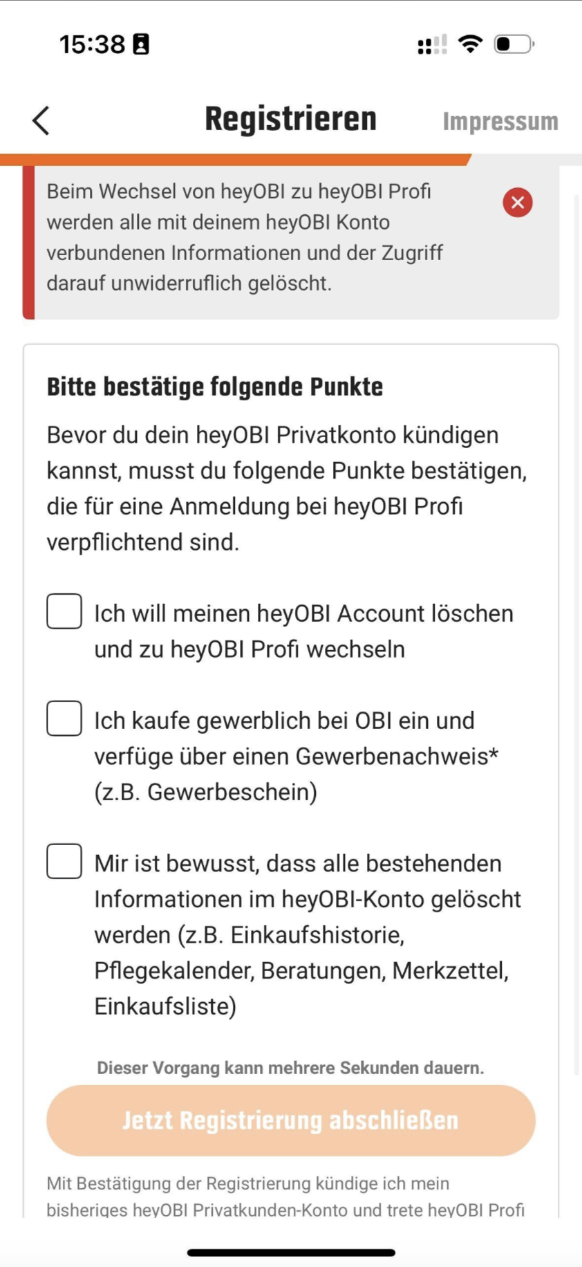Wichtig: Mit der Umwandlung wird das heyOBI Konto gelöscht inkl. aller damit verbundenen Daten (Einkaufshistorie im Markt, Beratungen, Merkzettel, Einkaufsliste, Pflegekalender).