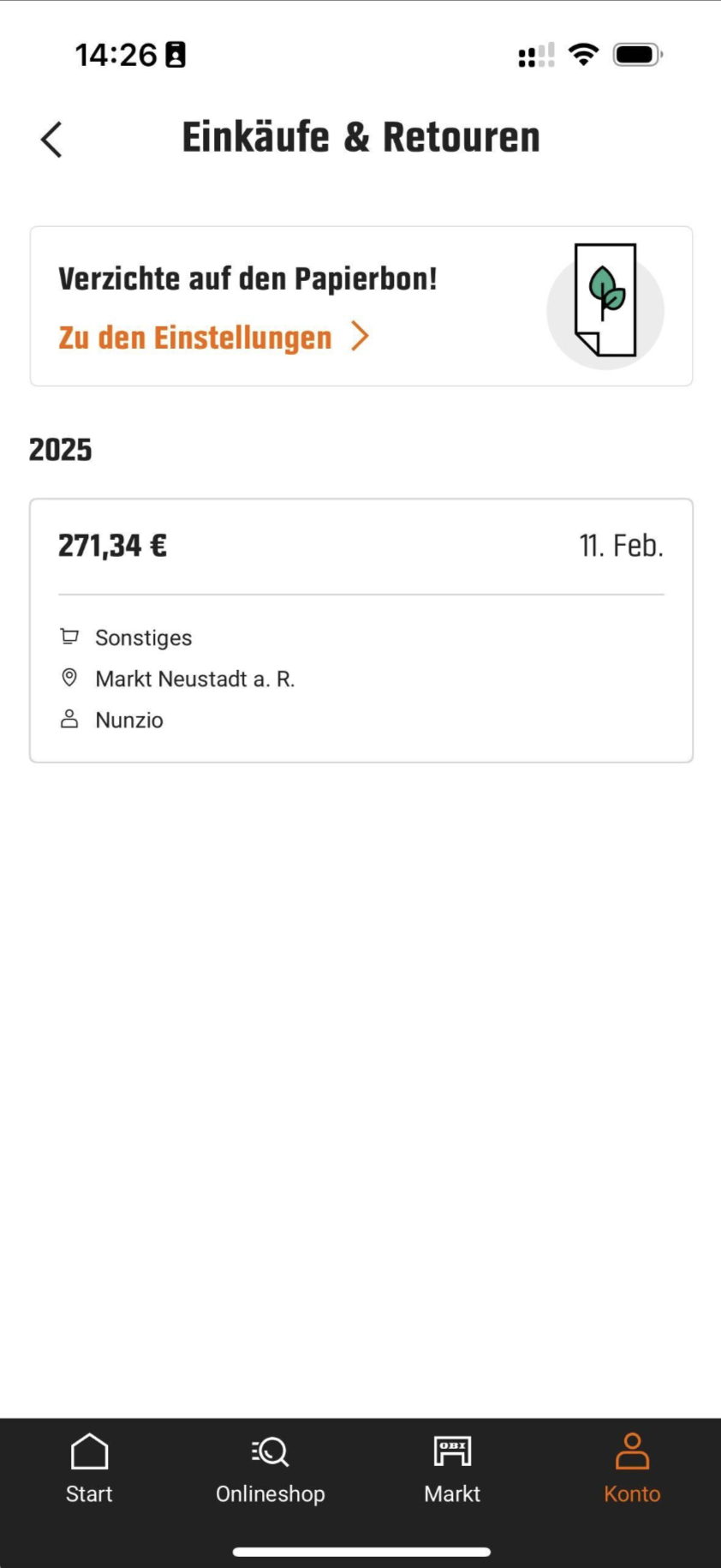 Du findest deine Einkäufe und den jeweils dazugehörigen Kassenbon in deinem heyOBI Profil in der heyOBI App oder auf der obi.de unter "Einkäufe & Retouren".